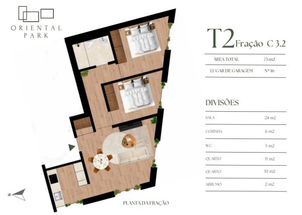 Inclui um lugar de garagem interior, assegurando estacionamento seguro para o seu automóvel, bem como uma arrecadação de 2 m² para arrumação adicional. O imóvel dispõe ainda de pré-instalação de ar condicionado, caixilharia em PVC para maior isolamento térmico e acústico, e video-porteiro para maior segurança.